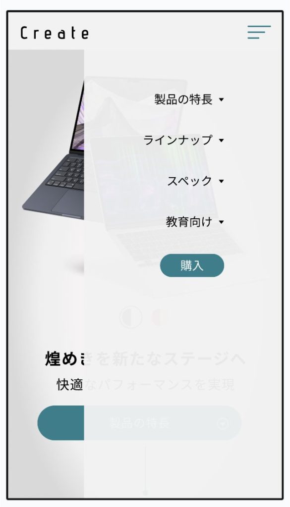 ハンバーガーメニューでデザインしましたが、初期案では横スクロールによるスライドメニューを考えていました。