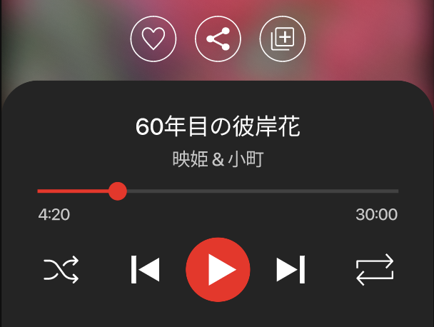 再生ボタンや曲の進行状況を示すプログレスバー、曲の再生に関連する操作を含むバーはダークモードの赤色でコントラスト比を意識しています。