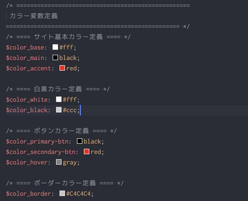 上記の基本的なカラー変数は常に定義しておりますので、デザインに合わせて色や変数名を変えてください。