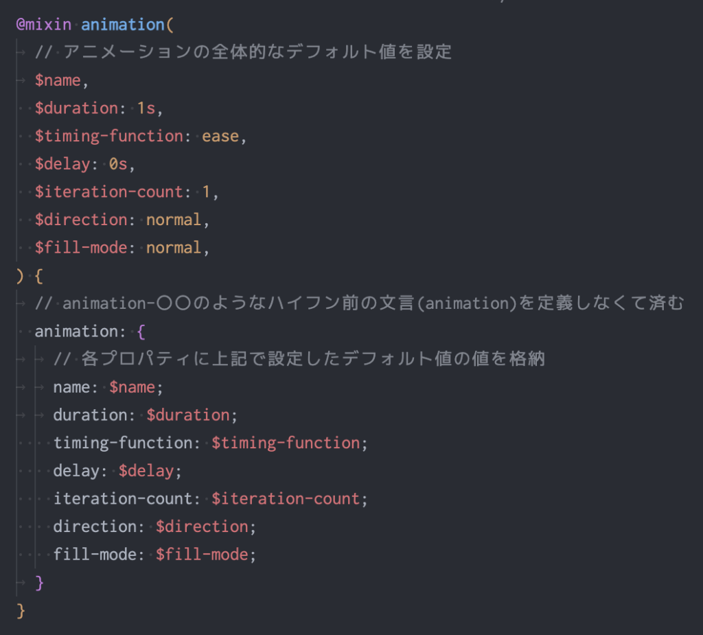 サイト内で使用するアニメーションの全体的なデフォルトをmixinを使い定義しています。