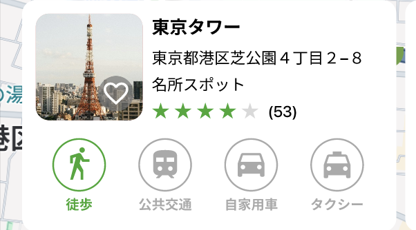 ルート表示はGoogleMapを参考にし、観光地情報に「徒歩」や「公共交通」による移動手段ボタンを載せることで、ユーザーの現在地からすぐにアクセス方法を表示することができる仕様を想定しています。